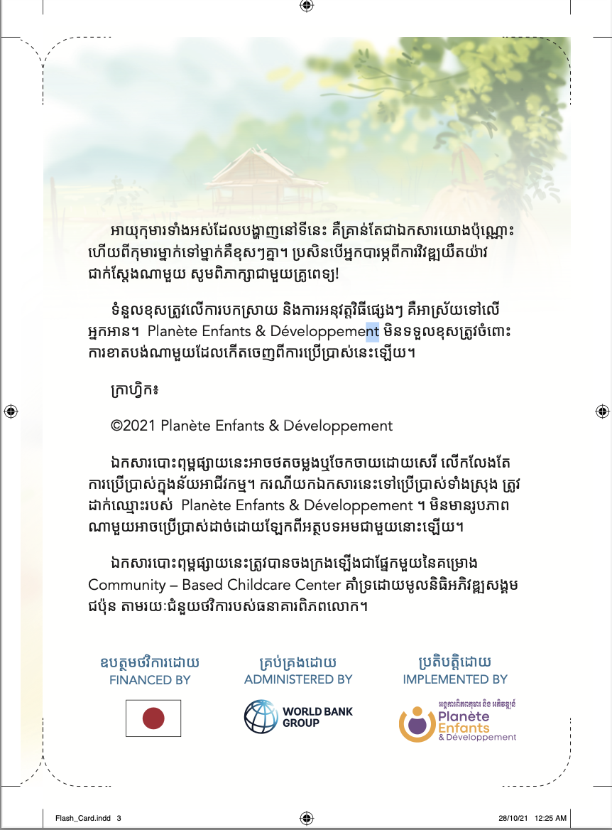This flash-card set was created for Planète Enfants & Développement to support teachers and young learners in Cambodia. The cards help strengthen early-stage vocabulary and visual recognition through simple, engaging illustrations designed for classroom interaction and playful learning.